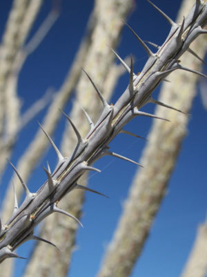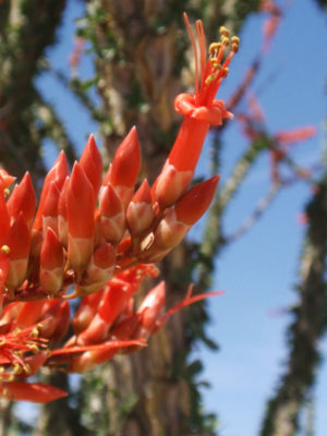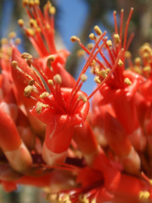 Curious-looking, long, whip-like, unbranched silver and green stems rise from the base like tentacles with spines. Bright crimson clusters of bell shaped flowers bloom from the tips of the mature stems and are relished by hummingbirds. Heavily branching from the base, a single mature plant base can have upwards of 20 or more upright stems that may reach 35 feet tall.