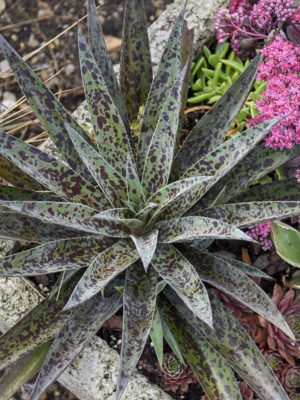 The refined, spiky habit of this Mangave will remind you of the top of a pineapple. 1” wide, dark green leaves are long and slender, with pronounced burgundy spotting. The spots will be more pronounced when in full sun and exposed to UV light. A waxy coating gives the leaves a minty-green finish. Leaves are packed in tightly to form a spiky rosette. Tiny spines line the margins, and a very sharp, cinnamon terminal spine complete the spiky look. Plant this Mangave in a yellow or tan container to complete the pineapple look! Photo Credit: Walters Gardens Inc