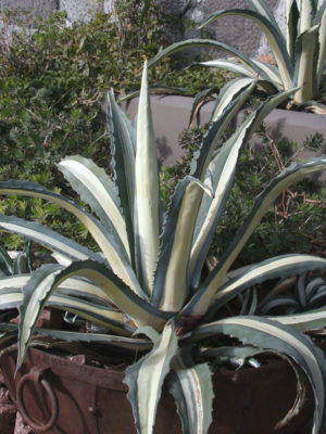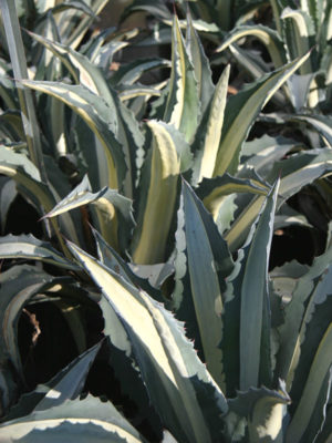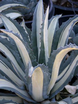 (XL Specimen, 6” Pot) Beautifully variegated, this upright rosette forming agave is our most popular for container gardens and dry residential and commercial landscapes. White centered foliage is margined in dusty gray-blue. Americana Mediopicta is a midsized agave reaching a modest three feet in height and width at maturity. Low to no maintenance required.